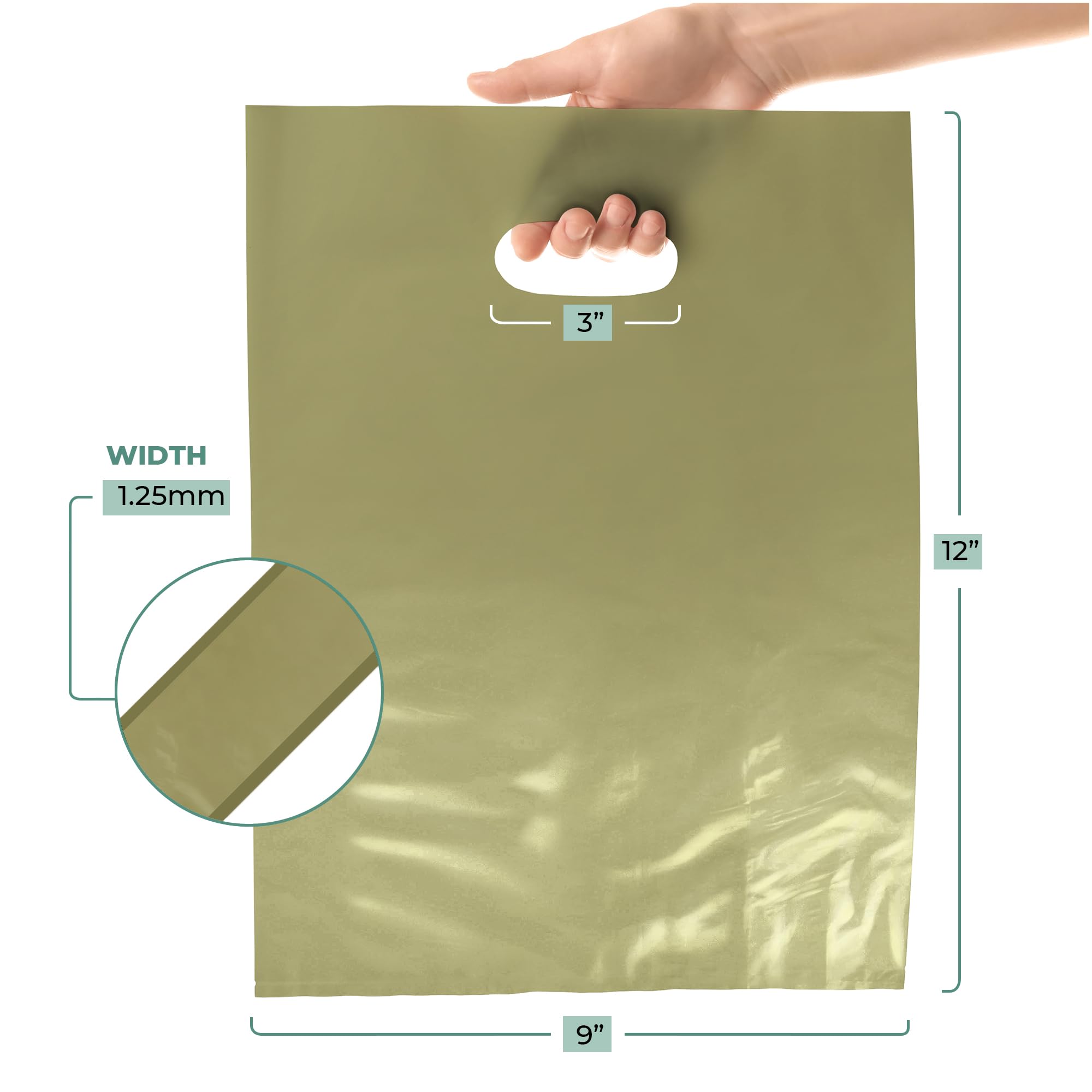 Pack of 100 Olive Glossy Bags Die Cut Handles, Measures: 9" x 12" by 1.25 Thickness