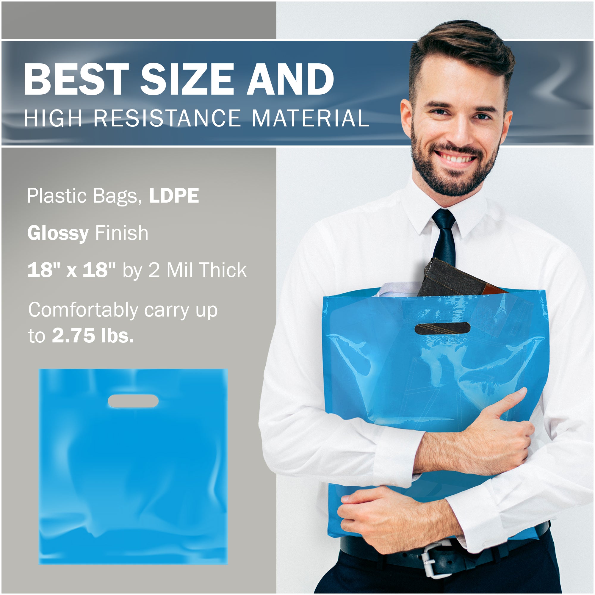Pack of 100 Blue Glossy Bags Die Cut Handles, Measures: 18" x 18" with 2 Thickness