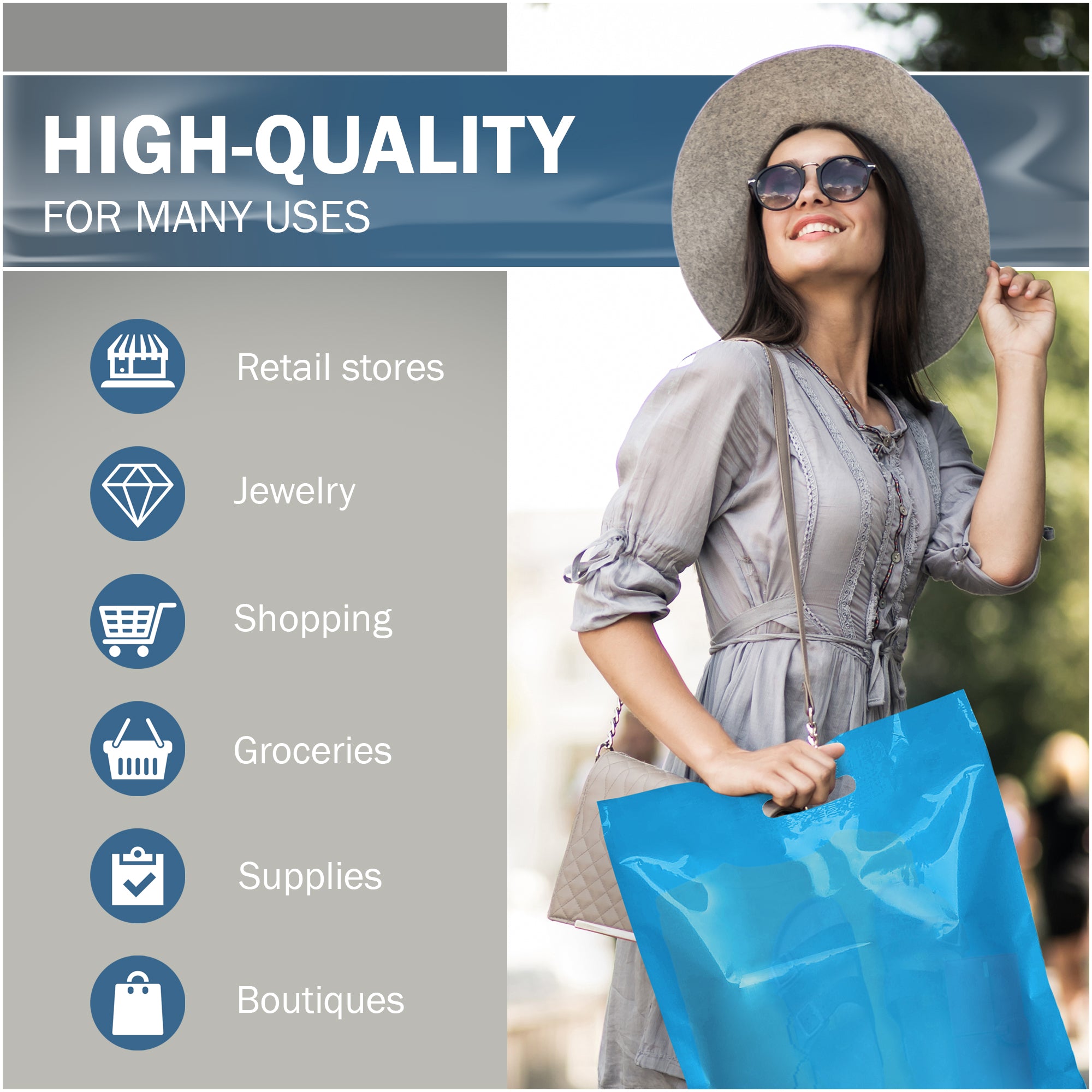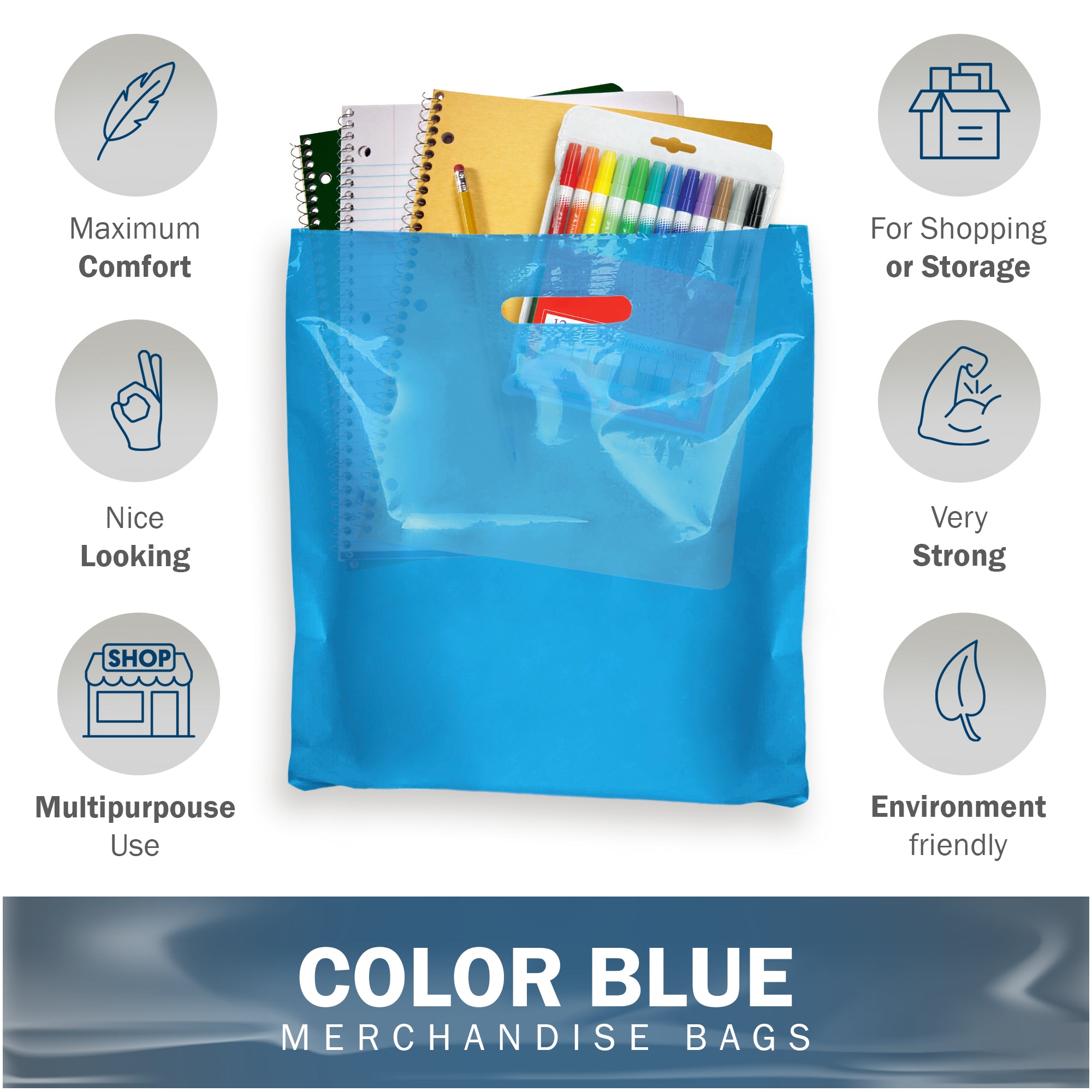 💯 Pack of 100 Blue Glossy Bags Die Cut Handles, Measures: 18" x 18" with 2 Thickness
